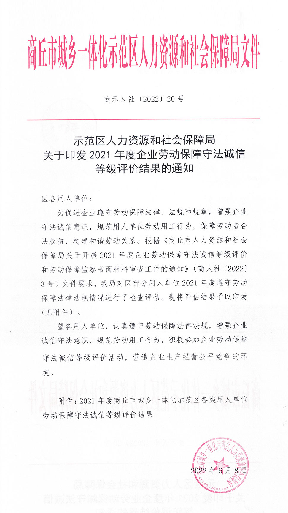 近日,商丘市示范區(qū)人力資源和社會保障局公布了《關于2021年度商丘市城鄉(xiāng)一體化示范區(qū)各類用人單位勞動保障守法誠信等級評價結果》,我公司再次被評為示范區(qū)勞動保障守法誠信A級示范單位,這一榮譽充分表明了勞動保障部門對公司勞動管理規(guī)范與員工權益保障等方面工作的充分肯定。
