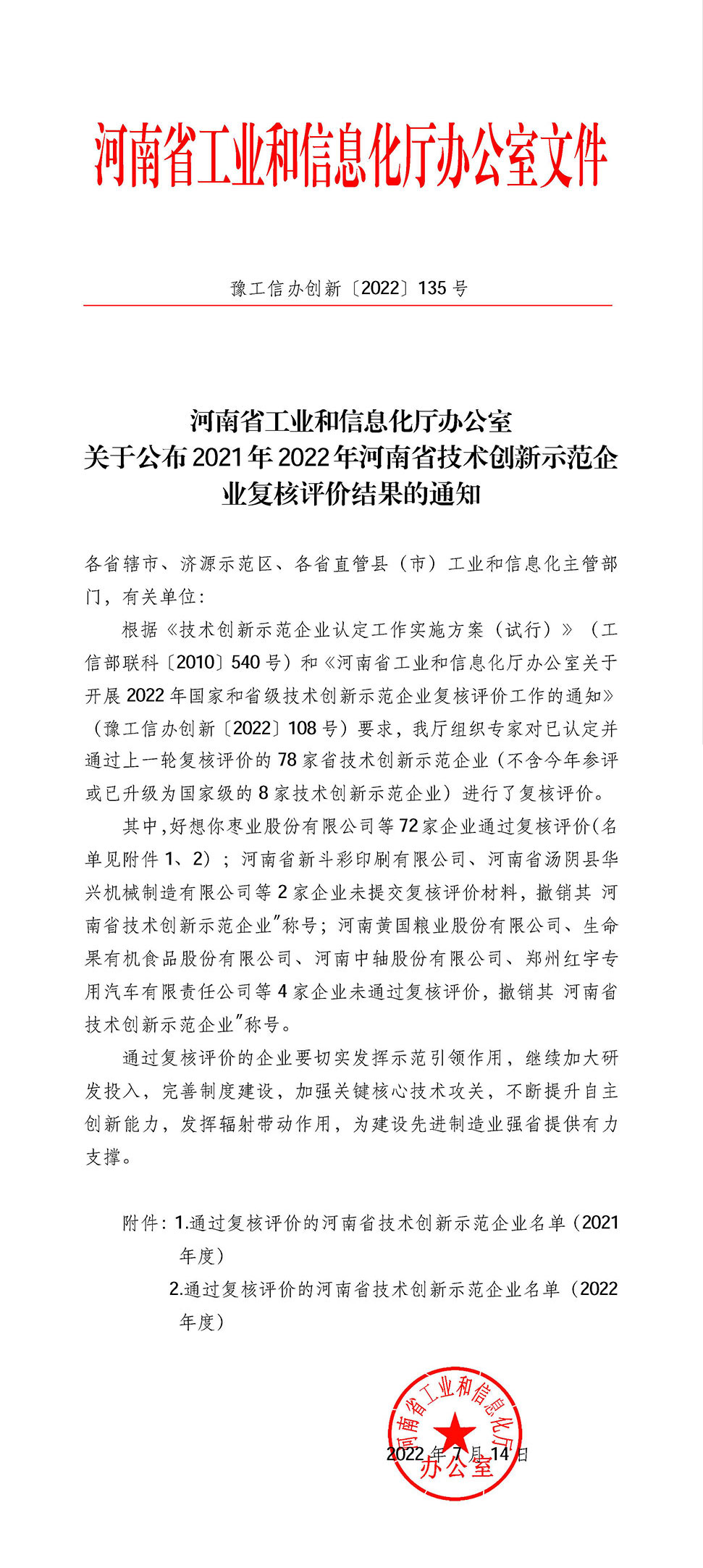 7月14日,河南省工業(yè)和信息化廳辦公室公布《關(guān)于公布2021年2022年河南省技術(shù)創(chuàng)新示范企業(yè)復(fù)核評(píng)價(jià)結(jié)果的通知》,我公司成功通過2022年復(fù)核評(píng)價(jià)。