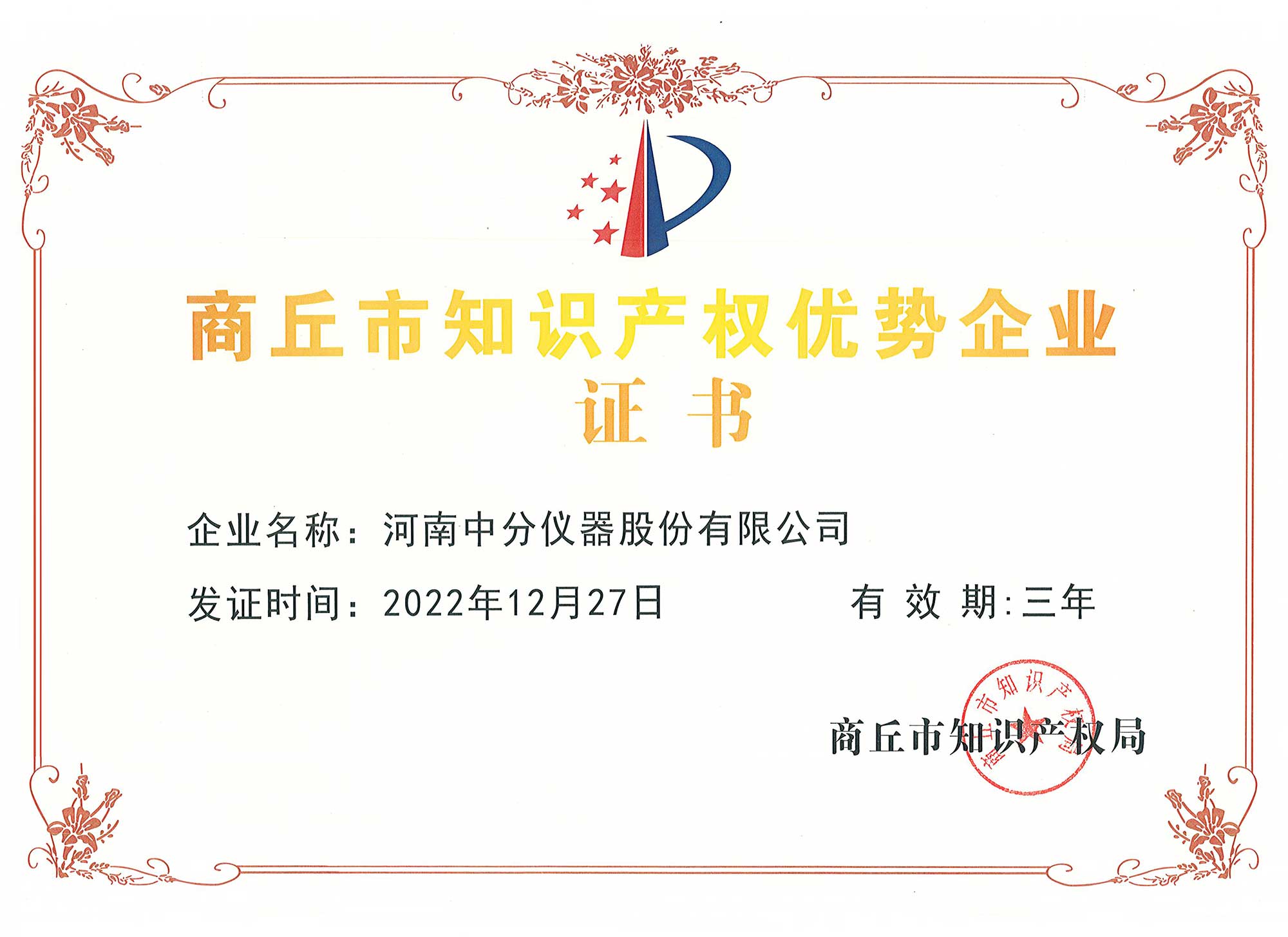 近日,我公司榮獲由商丘市知識產權局頒發的商丘市知識產權優勢企業證書,這項殊榮進一步證明了我公司在知識產權領域不俗的表現。
