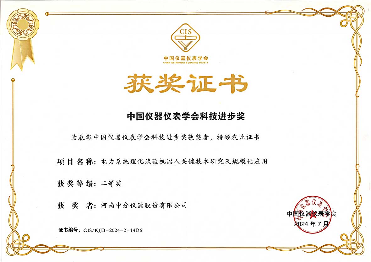 近日,我公司參與的《電力系統(tǒng)理化試驗機(jī)器人關(guān)鍵技術(shù)研究及規(guī)模化應(yīng)用》榮獲中國儀器儀表學(xué)會2024年科技進(jìn)步二等獎。