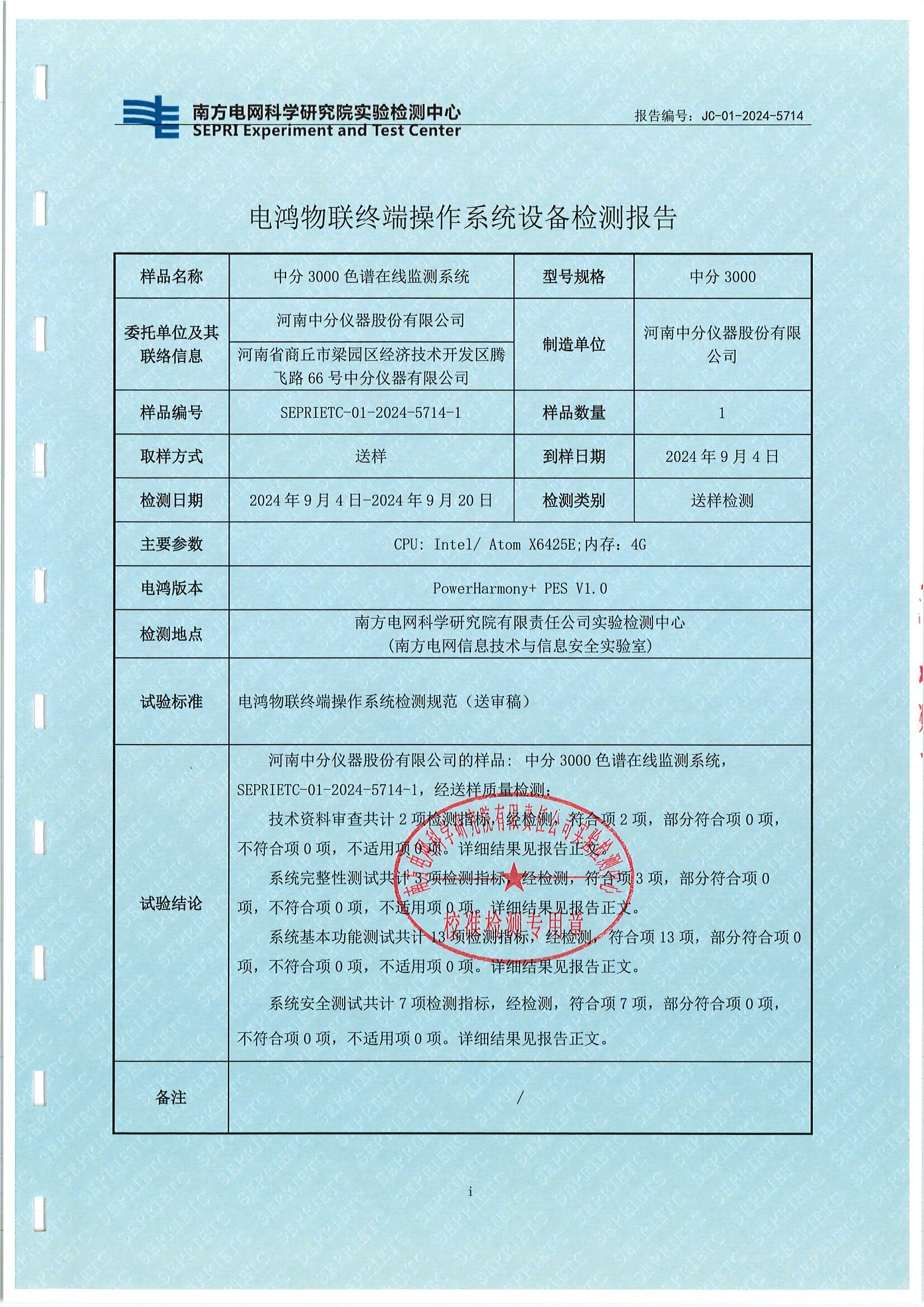近期中分3000色譜在線監測系統新開發應用程序,開啟了色譜在線監測產品適配電鴻操作系統實現萬物互聯新征程。24年9月份順利取得了南方電網科學研究院實驗檢測中心的檢測報告,色譜在線監測產品國產操作系統兼容性不斷提升,為行業的發展注入了新的活力。此次中分 3000 與電鴻操作系統的適配成功,為電力行業擺脫對國外操作系統的依賴,建立自主可控技術體系提供了有力的示范。