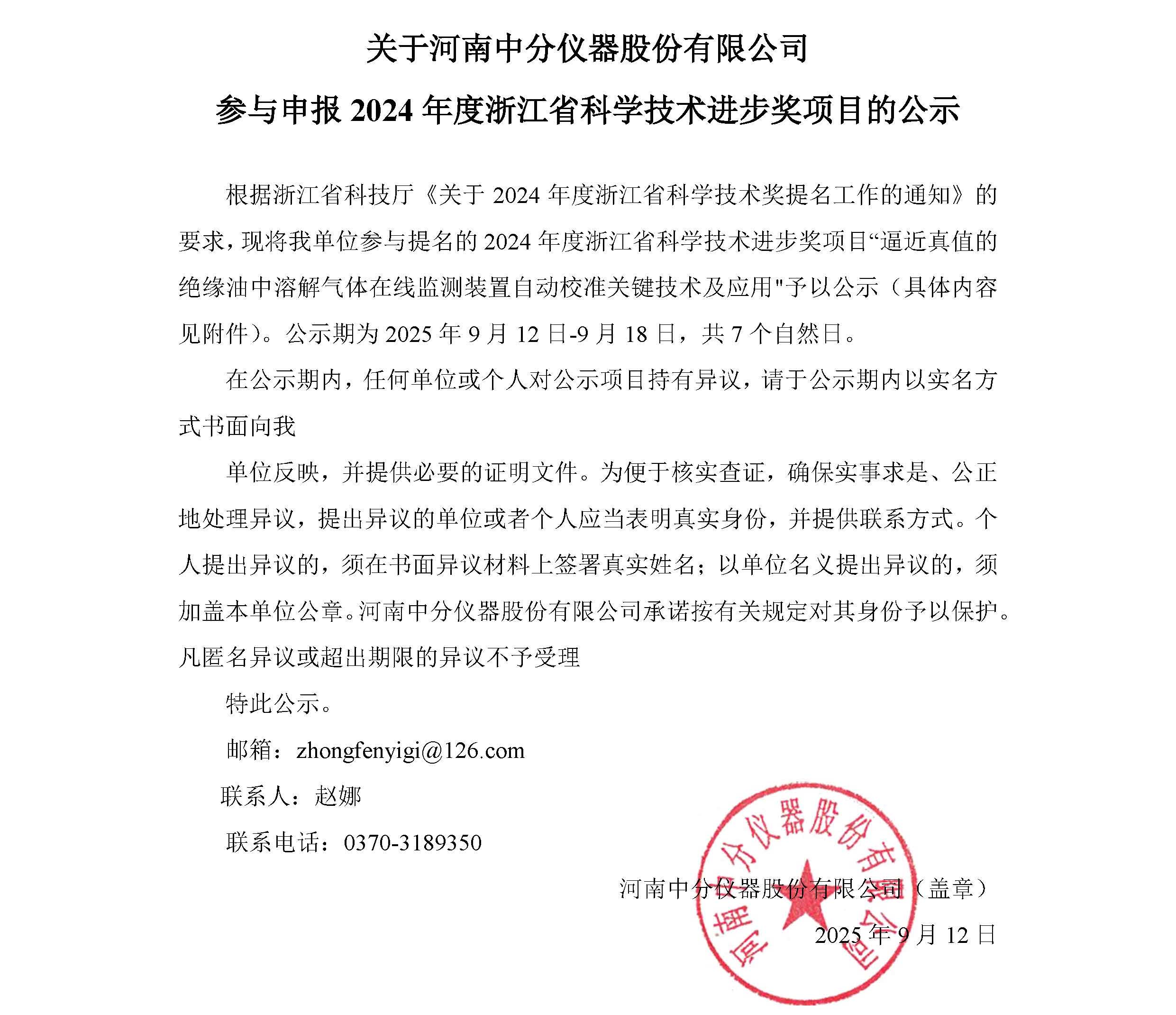 關(guān)于河南中分儀器股份有限公司參與申報(bào)2024年度浙江省科學(xué)技術(shù)進(jìn)步獎(jiǎng)項(xiàng)目的公示